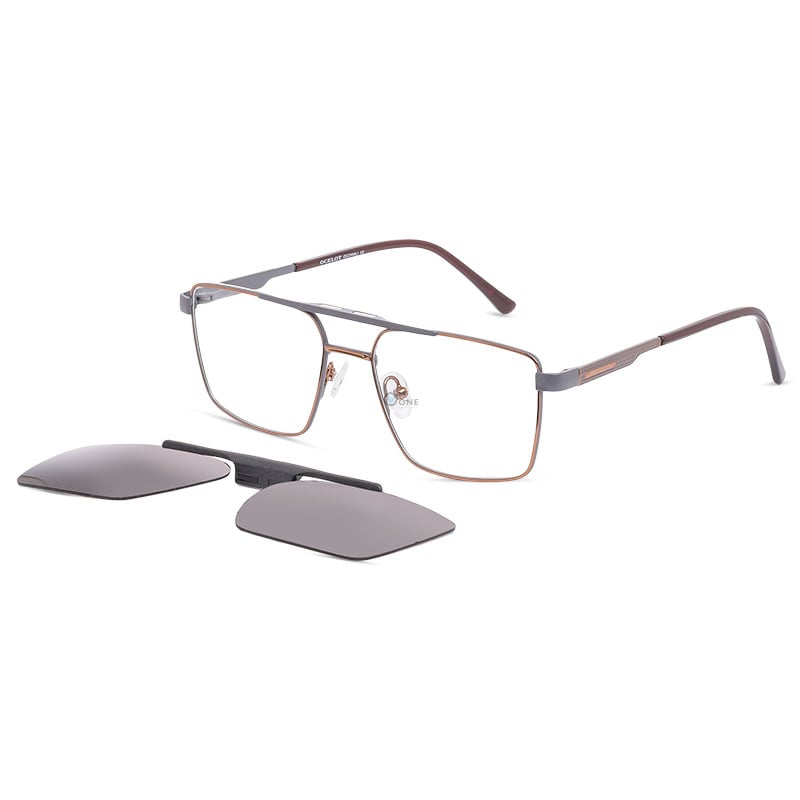December 1, 2024Full Metal Rectangular Clip-On Glasses in Gray with Copper Finish and Brown Polarized Flip-Up Lens