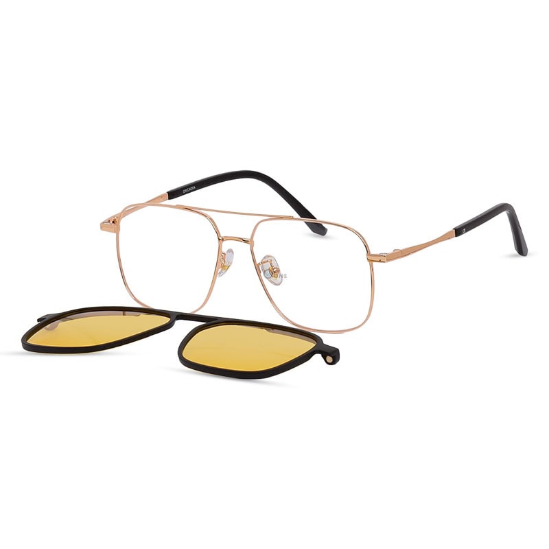 Experience superior visual clarity in any condition with the Orcadia Gold Square Aviator Clip-On Glasses. This premium eyewear set combines a luxurious gold-tone stainless steel frame with a specialized Yellow Tint Magnetic Clip-on, designed for function-first style.